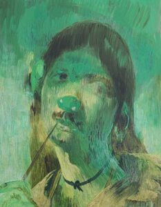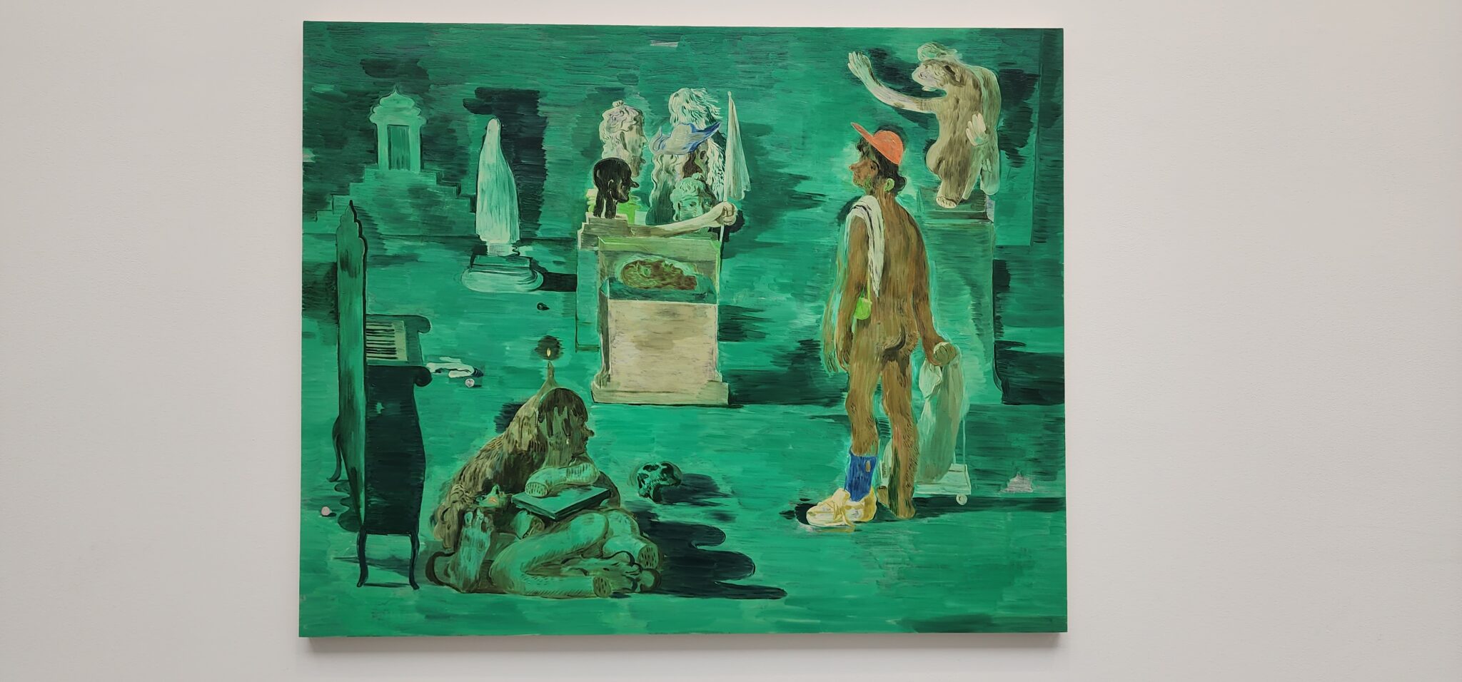 在 Chelsea 展出的新绘画中,图尔继续描绘那些棕色皮肤的年轻人——他们在昏暗的室内沉思、在朋友间放松、在夜色中寻找归属。这些场景看似日常,却被一种近乎戏剧化的光线包裹:绿色、紫色、琥珀色的光从窗外或屏幕中溢出,使人物的情绪被放大到几乎要溢出画框。图尔的光线从来不是自然主义的,它更像是一种心理机制,揭示人物的内在状态,也暗示他们与外部世界的距离。《Wish Maker》中,这种光线变得更加不安,更像是愿望与现实之间的缝隙。