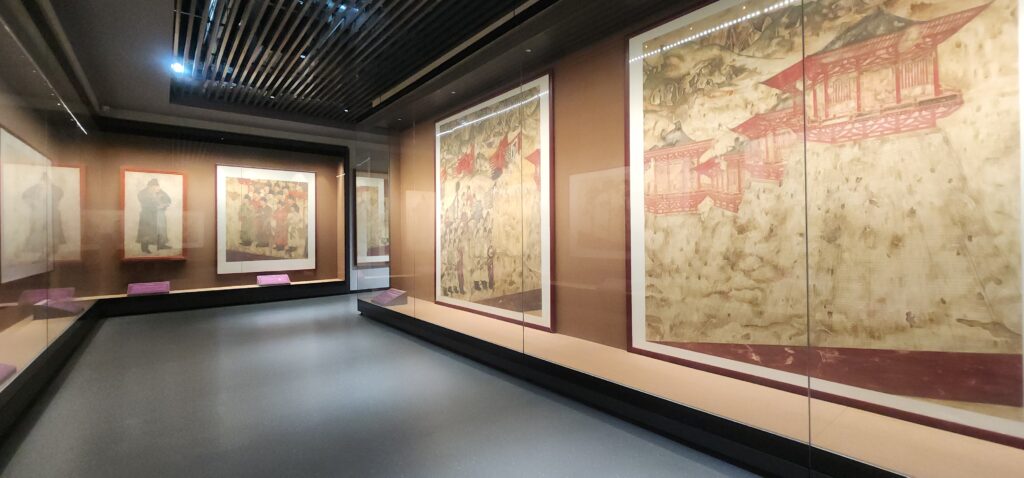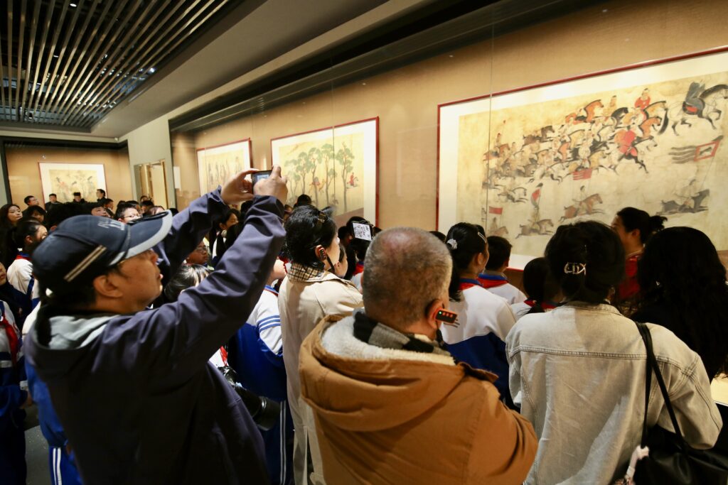 采访团走进乾陵壁画馆,近距离欣赏唐代壁画艺术的精妙细节。讲解员向记者介绍,乾陵壁画以人物、仪仗、车马、宫廷生活等题材为主,线条流畅、设色典雅,是研究盛唐社会结构、审美风尚与礼制文化的重要实物资料。壁画中人物的服饰纹样、发式装扮、马具器物等细节,均真实反映了唐代的生活图景与文化气象。