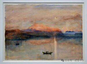 透纳不光是在油画中运用这种独特的色彩语言,而且也把水彩画作为探索这种色彩语言的更为海阔天空的实践。这次展出的水彩画,设色松散随意,笔触潇洒飞扬,小小的纸上充满了神鬼莫测的色彩和影影绰绰的影形,具体形象和轮廓只是隐隐可见,偶尔在某个角上出现几只小舟或人物。透纳一生之中,一直没有把这些水彩画给公众过目,而是把它们视为隐秘的私有空间,似乎完全为了自悦和放松而画,这些水彩画更像是一些大画的色稿,有些仅仅是对一些场景的记录。