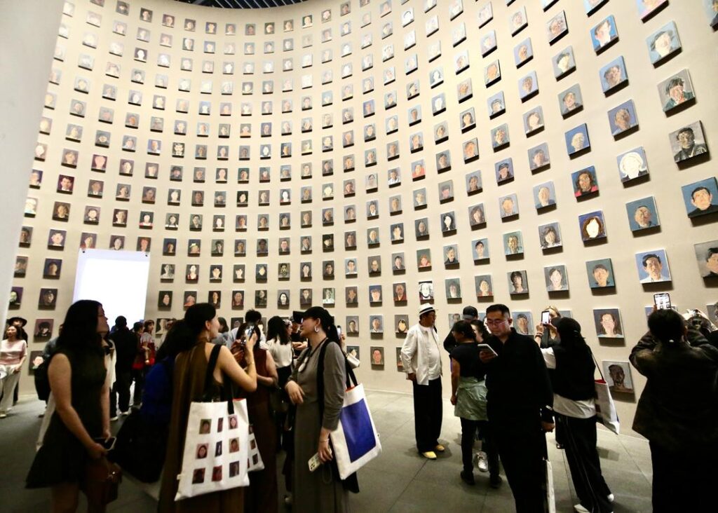 展厅中心为此次展览的核心部分:13米的圆柱体空间内,千余幅面孔排列如“千佛洞”。这种极致的陈设,意在去除表象、回归本心——童雁汝南坚持近乎苦行僧式的“修行”,不随波逐流于当代艺术的潮流游戏,而是通过无数次的“面对面”写生,在方寸画布间构建关于人类精神的微观世界。