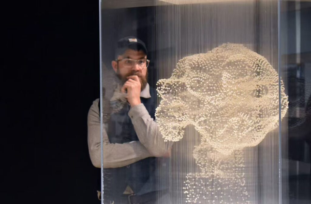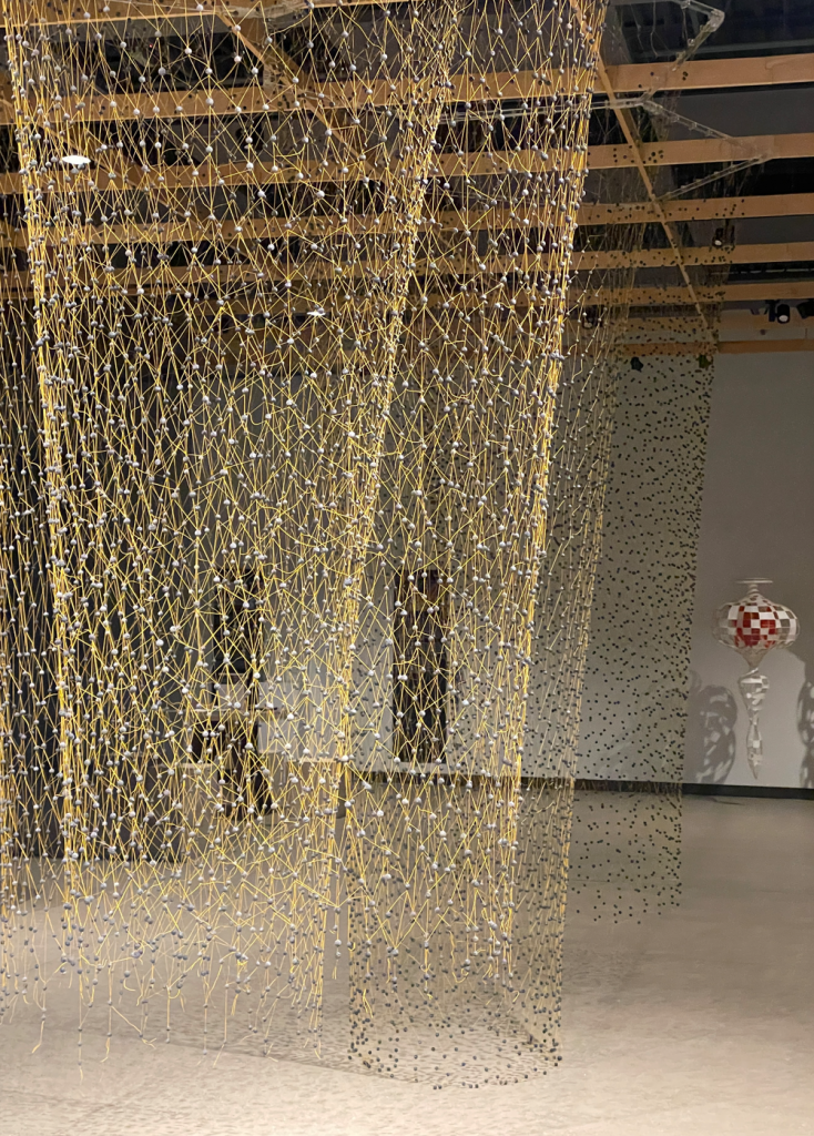 展览以“游历”作为核心隐喻,通过作品呈现漂移、聚散、生长等状态,象征身份在迁徙过程中的流动与重塑。其中,《In The Shells》(2019创作)以纸、藤条与 UV 涂层构成贝壳般的结构,象征保护、孕育与文化层叠,是展览的重要视觉焦点。其他作品则以淡水珍珠暗示文化沉积,以松针指向迁徙路径,构建出介于植物、器皿与神话生物之间的抽象形态,营造出介于现实与神话之间的梦境式空间。光影与半透明材料的叠加使作品呈现“呼吸感”,进一步强化了展览的沉浸式体验。